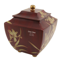 The Orchid Burgundy Adult Cremation Urn is an elegant tribute, crafted from durable brass with a deep burgundy finish and adorned with hand-engraved orchid blossoms. The square silhouette conveys both strength and grace, while the golden floral design symbolizes beauty, renewal, and eternal love. With a 200 cubic inch capacity, this urn is designed to hold the remains of an adult up to 200 lbs. A threaded lid ensures secure and lasting closure. Personalization is available, allowing you to add custom text for a meaningful tribute.