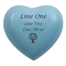 The Pearl Blue Glossy Heart Small Cremation Urn is a tender keepsake crafted from durable brass. Its radiant glossy pearl blue finish and heart-shaped design symbolize eternal love and remembrance. With a 20 cubic inch capacity, it is ideal for holding a meaningful portion of ashes, allowing families to share remains or keep a tribute close. Measuring 4.2" H Ã 4.5" W Ã 2.5" D, it features a secure back closure to keep ashes safely preserved. A matching display stand is included, and the urn can be personalized with engraving, making it a truly unique memorial.