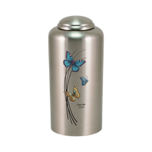 Pewter Brass Butterfly Artwork Adult Cremation Urn is a beautifully crafted memorial urn made from solid brass with a brushed pewter finish. The elegant butterfly motif represents renewal and transformation, making it a meaningful tribute to a cherished life. With a 230 cubic inch capacity and a secure threaded lid, it provides a safe and lasting resting place for adult ashes. Its refined metallic tone complements the colorful artwork, creating a peaceful and dignified presence. Personalization is available in black engraving.