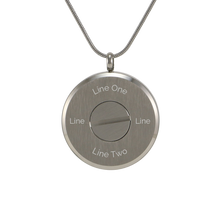 The Pewter Round Hinged Circles, Stainless Steel Cremation Necklace includes two interchangeable inserts in pewter and bronze (14k plated). Crafted from stainless steel, the pendant features a large compartment on the back for ashes, secured by a threaded back closure. A lobster claw clasp attaches the matching 19-inch chain and the necklace comes with a fill kit .
