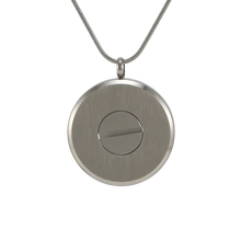 The Pewter Round Hinged w/ Bronze Birds, 14K Gold-Plated Cremation Necklace features a clear glass front with a hinged design showcasing a bronze bird motif set against a 14K gold-plated insert. Made from durable 316 stainless steel, the pendant includes a discreet threaded back compartment designed to hold a nominal amount of ashes. A 19-inch matching chain and fill kit.