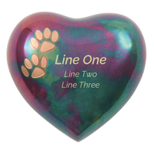 The Raku Brass Heart Small Pet Urn with Double Paw Print is a beautifully crafted keepsake designed to honor the memory of a beloved pet. Made from durable brass with a stunning raku finish, this heart-shaped urn features two delicate bronze paw prints, symbolizing the lasting bond you shared. With a 20 cubic inch capacity. The urn is securely sealed with a threaded back closure. Personalization with custom engraving is available, making this urn a truly meaningful and unique memorial piece.