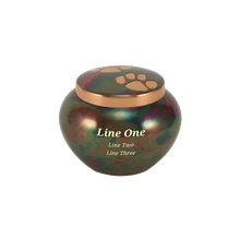 The Raku Bronze Two Paw Prints Small Pet Cremation Urn is crafted from durable brass and finished in a shimmering raku plated surface with iridescent color variations. Its petite rounded shape is topped with a coordinating lid featuring two embossed paw prints, symbolizing the love and companionship shared with a cherished pet. This urn provides 25 cubic inches of space and closes securely with a threaded lid. Custom personalization is available and engraved in a complementary brass engraving color, offering a meaningful way to honor your pet. Thoughtfully designed, it serves as a warm and dignified memorial for a beloved small companion.
