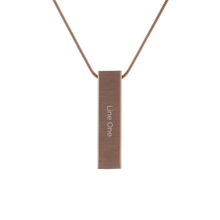 The Rose Gold Pillar w/ Cubic Zirconias, 19" Chain Cremation Necklace features a modern vertical bar crafted from durable stainless steel with a warm rose gold-plated finish. Three inset cubic zirconias add elegant brilliance to its minimalist form. The pendant includes a large threaded bottom compartment designed to hold a nominal amount of ashes securely. A lobster claw clasp ensures easy assembly, and each necklace arrives with a matching 19-inch chain and fill kit, for complete convenience.