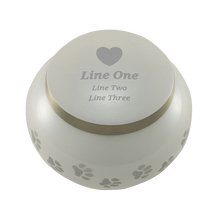 The Round Glossy Pearl White Brass Paw Print Band Small Pet Cremation Urn offers a gentle and comforting memorial crafted from durable brass with a glossy pearl finish. A ring of pewter paw prints encircles the urn, symbolizing the lasting imprint a beloved pet leaves on the heart. Its 25 cubic inch capacity is suited for small pets, and the secure threaded lid helps keep ashes protected. This urn can also be personalized, with engraving available in muted pewter to complement the soft pearl tone. Its rounded silhouette and luminous finish make it a calm, dignified piece for display in any home.