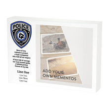 The Shadow Box Urn for Large Pet Ashes & Memento with K9 Badge Design is a dignified memorial for service dogs who faithfully protected and served. Crafted from MDF with a clean white finish, the side panel displays a police K9 badge emblem alongside a heartfelt verse honoring courage, loyalty, and partnership. With a 70 cubic inch capacity, this urn secures with a sliding back panel and includes a display area for photos, collars, or badges. Personalization with black engraving allows each tribute to honor the life and service of a beloved K9 hero.