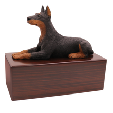 The Simply Series Black Doberman, Lying Down Figurine Pet Cremation Urn is a refined pet cremation urn and Doberman urn featuring a detailed lying down figurine on a furniture-style base. Choose Simply Oak (hardwood) & Simply Walnut (medium density fiberboard (MDF) with real walnut wood veneers and a dark walnut stain) for an elegant indoor pet memorial. Pet ashes are installed through a removable bottom panel secured with screws for a dependable, secure pet urn closure. Optional engraving is available on a premium leaded brass nameplate (2 lines, max 25 characters per line). Figurines are attached facing forward; photos may show a different angle selected to highlight the figurineâs shape. Colors may vary slightly due to lighting and screen settings.
