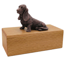 The Simply Series Jumbo Bronze Basset Hound, Sitting Figurine Pet Cremation Urn is a refined pet cremation urn and Basset Hound urn featuring a sitting figurine with a bronze-like finish on a furniture-style base. Choose Simply Oak (hardwood) & Simply Walnut (MDF with real walnut wood veneers and a dark walnut stain) for an elegant indoor pet memorial. Pet ashes are installed through a removable bottom panel secured with screws for a dependable, secure pet urn and screw-secured bottom panel closure. Optional engraving is available on a premium leaded brass nameplate (2 lines, max 25 characters per line). Figurines are attached facing forward; photos may show a different angle selected to highlight the figurineâs shape. Colors may vary slightly due to lighting and screen settings.