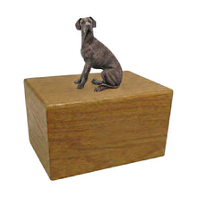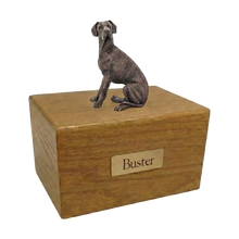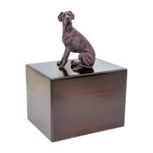 The Simply Series Jumbo Bronze Great Dane with Ears Down, Sitting Figurine Pet Cremation Urn is a refined pet cremation urn and figurine urn created as a lasting pet memorial. The resin Great Dane Sitting figurine features a bronze-like finish (not real bronze) and is paired with Simply Oak & Simply WalnutâSimply Oak is hardwood, and Simply Walnut is MDF with real walnut wood veneers and a dark walnut stainâcreating an elegant Oak & Walnut style pet urn. Pet ashes are installed through a removable bottom panel and protected by a screw-secured bottom panel closure secured with screws for secure keeping. Personalization is available with an optional engraved brass nameplate on premium leaded brass (2 lines, max 25 characters per line). Figurines are attached facing forward (photos may show different angles), and colors may vary slightly due to lighting/screen settings.Â