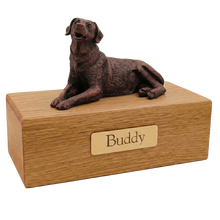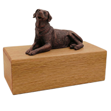 The Simply Series Bronze Labrador, Lying Down Figurine Pet Cremation Urn is a refined pet cremation urn and figurine urn designed as a timeless pet memorial for honoring a beloved companion. The resin Labrador figurine features a bronze-like finish and rests on Simply Oak & Simply WalnutâSimply Oak is hardwood, while Simply Walnut is MDF with real walnut wood veneers and a dark walnut stainâcreating an elegant Oak & Walnut style pet urn for home display. Pet ashes are installed through a removable bottom panel secured with screws for safe keeping, and an optional engraved brass nameplate is available on premium leaded brass (2 lines, max 25 characters per line). Figurines are attached facing forward (photos may show different angles), and colors may vary slightly due to lighting/screen settings.