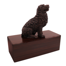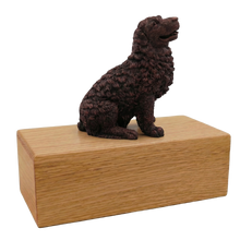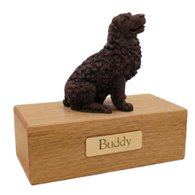 The Simply Series Bronze Newfoundland, Sitting Figurine Pet Cremation Urn is a refined pet cremation urn and figurine urn designed as a timeless pet memorial for honoring a devoted companion. The resin Newfoundland figurine features a bronze-like finish and rests on Simply Oak & Simply WalnutâSimply Oak is hardwood, while Simply Walnut is MDF with real walnut wood veneers and a dark walnut stainâcreating an elegant Oak & Walnut style pet urn for home display. Pet ashes are installed through a removable bottom panel secured with screws for safe keeping, and an optional engraved brass nameplate is available on premium leaded brass (2 lines, max 25 characters per line). Figurines are attached facing forward (photos may show different angles), and colors may vary slightly due to lighting/screen settings.
