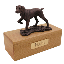 The Simply Series Bronze Pointer, Walking Figurine Pet Cremation Urn is a refined pet cremation urn and figurine urn created as a timeless pet memorial for honoring a devoted companion. The resin Pointer figurine features a bronze-like finish and rests on Simply Oak & Simply WalnutâSimply Oak is hardwood, while Simply Walnut is MDF with real walnut wood veneers and a dark walnut stainâcreating an elegant Oak & Walnut style pet urn for home display. Pet ashes are installed through a removable bottom panel secured with screws for safe keeping, and an optional engraved brass nameplate is available on premium leaded brass (2 lines, max 25 characters per line). Figurines are attached facing forward (photos may show different angles), and colors may vary slightly due to lighting/screen settings.
