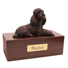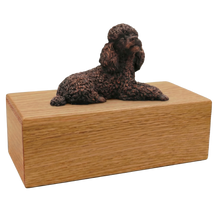 The Simply Series Bronze Poodle, Lying Down Figurine Pet Cremation Urn is a refined pet cremation urn and figurine urn designed as a timeless pet memorial for honoring a beloved companion. The resin Poodle figurine features a bronze-like finish and rests on Simply Oak & Simply WalnutâSimply Oak is hardwood, while Simply Walnut is MDF with real walnut wood veneers and a dark walnut stainâcreating an elegant Oak & Walnut style pet urn for home display. Pet ashes are installed through a removable bottom panel secured with screws for safe keeping, and an optional engraved brass nameplate is available on premium leaded brass (2 lines, max 25 characters per line). Figurines are attached facing forward (photos may show different angles), and colors may vary slightly due to lighting/screen settings.