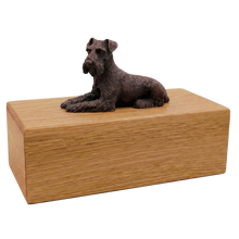 The Simply Series Bronze Schnauzer, Ears Down Figurine Pet Cremation Urn is a refined pet cremation urn and figurine urn designed as a timeless pet memorial for honoring a devoted companion. The resin Schnauzer figurine features a bronze-like finish and rests on Simply Oak & Simply WalnutâSimply Oak is hardwood, while Simply Walnut is MDF with real walnut wood veneers and a dark walnut stainâcreating an elegant Oak & Walnut style pet urn for home display. Pet ashes are installed through a removable bottom panel secured with screws for safe keeping, and an optional engraved brass nameplate is available on premium leaded brass (2 lines, max 25 characters per line). Figurines are attached facing forward (photos may show different angles), and colors may vary slightly due to lighting/screen settings.Â