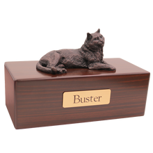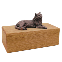 The Simply Series Bronze Tabby, Lying Down Figurine Pet Cremation Urn is a refined pet cremation urn and cat cremation urn featuring a lying down Tabby figurine with a bronze-like finish on a furniture-style base. Choose Simply Oak (hardwood) & Simply Walnut (MDF with real walnut wood veneers and a dark walnut stain) for an elegant indoor pet memorial. Pet ashes are installed through a removable bottom panel secured with screws for a dependable, secure pet urn and screw-secured bottom panel closure. Optional engraving is available on a premium leaded brass nameplate (2 lines, max 25 characters per line). Figurines are attached facing forward; photos may show a different angle selected to highlight the figurineâs shape. Colors may vary slightly due to lighting and screen settings.