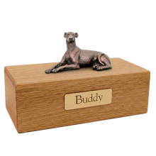 The Simply Series Bronze Whippet, Lying Down Figurine Pet Cremation Urn is a refined pet cremation urn and figurine urn designed as a lasting pet memorial. The resin Whippet Lying Down figurine features a bronze-like finish (not real bronze) and is paired with Simply Oak & Simply WalnutâSimply Oak is hardwood, and Simply Walnut is MDF with real walnut wood veneers and a dark walnut stainâcreating an elegant Oak & Walnut style pet urn. Pet ashes are installed through a removable bottom panel and protected by a screw-secured bottom panel closure secured with screws for secure keeping. Personalization is available with an optional engraved brass nameplate on premium leaded brass (2 lines, max 25 characters per line). Figurines are attached facing forward (photos may show different angles), and colors may vary slightly due to lighting/screen settings.Â