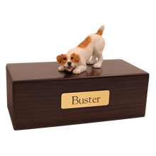 The Simply Series Brown Jack Russell Terrier, Play Bow Figurine Pet Cremation Urn is a refined pet cremation urn and Jack Russell Terrier urn featuring a playful bow figurine on a furniture-style base. Choose Simply Oak (hardwood) & Simply Walnut (medium density fiberboard (MDF) with real walnut wood veneers and a dark walnut stain) for an elegant indoor pet memorial. Pet ashes are installed through a removable bottom panel secured with screws for a dependable, secure pet urn closure. Optional engraving is available on a premium leaded brass nameplate (2 lines, max 25 characters per line). Figurines are attached facing forward; photos may show a different angle selected to highlight the figurineâs shape. Colors may vary slightly due to lighting and screen settings.