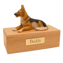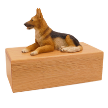 The Simply Series German Shepherd, Lying Down Figurine Pet Cremation Urn is a refined pet cremation urn and German Shepherd urn featuring a detailed lying down figurine on a furniture-style base. Choose Simply Oak (hardwood) & Simply Walnut (medium density fiberboard (MDF) with real walnut wood veneers and a dark walnut stain) for an elegant indoor pet memorial. Pet ashes are installed through a removable bottom panel secured with screws for a dependable, secure pet urn closure. Optional engraving is available on a premium leaded brass nameplate (2 lines, max 25 characters per line). Figurines are attached facing forward; photos may show a different angle selected to highlight the figurineâs shape. Colors may vary slightly due to lighting and screen settings.