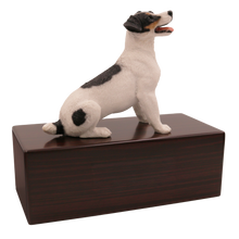 The Simply Series Jack Russell Terrier, Sitting Down Figurine Pet Cremation Urn is a refined pet cremation urn and Jack Russell Terrier urn featuring a detailed sitting figurine on a furniture-style base. Choose Simply Oak (hardwood) & Simply Walnut (medium density fiberboard (MDF) with real walnut wood veneers and a dark walnut stain) for an elegant indoor pet memorial. Pet ashes are installed through a removable bottom panel secured with screws for a dependable, secure pet urn closure. Optional engraving is available on a premium leaded brass nameplate (2 lines, max 25 characters per line). Figurines are attached facing forward; photos may show a different angle selected to highlight the figurineâs shape. Colors may vary slightly due to lighting and screen settings.