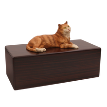 The Simply Series Orange Tabby, Lying Down Figurine Pet Cremation Urn is a refined pet cremation urn and cat cremation urn featuring a detailed lying down Orange Tabby figurine on a furniture-style base. Choose Simply Oak (hardwood) & Simply Walnut (medium density fiberboard (MDF) with real walnut wood veneers and a dark walnut stain) for an elegant indoor pet memorial. Pet ashes are installed through a removable bottom panel secured with screws for a dependable, secure pet urn closure. Optional engraving is available on a premium leaded brass nameplate (2 lines, max 25 characters per line). Figurines are attached facing forward; photos may show a different angle selected to highlight the figurineâs shape. Colors may vary slightly due to lighting and screen settings.