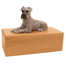 The Simply Series Silver Schnauzer, Ears Down Figurine Pet Cremation Urn is a refined pet cremation urn and Schnauzer urn featuring a detailed ears-down figurine on a furniture-style base. Choose Simply Oak (hardwood) & Simply Walnut (medium density fiberboard (MDF) with real walnut wood veneers and a dark walnut stain) for an elegant indoor pet memorial. Pet ashes are installed through a removable bottom panel secured with screws for a dependable, secure pet urn closure. Optional engraving is available on a premium leaded brass nameplate (2 lines, max 25 characters per line). Figurines are attached facing forward; photos may show a different angle selected to highlight the figurineâs shape. Colors may vary slightly due to lighting and screen settings.