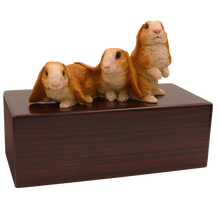 The Simply Series Three Brown Rabbits, Side By Side Figurine Pet Cremation Urn is a refined pet cremation urn featuring a three-rabbit figurine arranged side by side on a furniture-style base. Choose Simply Oak (hardwood) & Simply Walnut (medium density fiberboard (MDF) with real walnut wood veneers and a dark walnut stain) for an elegant indoor pet memorial. Pet ashes are installed through a removable bottom panel secured with screws for a dependable, secure pet urn closure. Optional engraving is available on a premium leaded brass nameplate (2 lines, max 25 characters per line). Figurines are attached facing forward; photos may show a different angle selected to highlight the figurineâs shape. Colors may vary slightly due to lighting and screen settings.