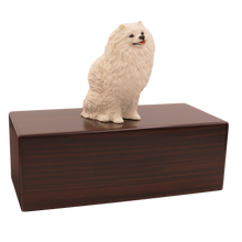 The Simply Series White Pomeranian, Sitting Figurine Pet Cremation Urn is a refined pet cremation urn and Pomeranian urn featuring a detailed sitting figurine on a furniture-style base. Choose Simply Oak (hardwood) & Simply Walnut (medium density fiberboard (MDF) with real walnut wood veneers and a dark walnut stain) for an elegant indoor pet memorial. Pet ashes are installed through a removable bottom panel secured with screws for a dependable, secure pet urn closure. Optional engraving is available on a premium leaded brass nameplate (2 lines, max 25 characters per line). Figurines are attached facing forward; photos may show a different angle selected to highlight the figurineâs shape. Colors may vary slightly due to lighting and screen settings.