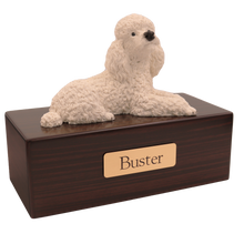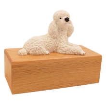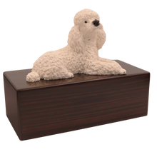 The Simply Series White Poodle, Lying Down Figurine Pet Cremation Urn is a refined pet cremation urn and Poodle urn featuring a detailed lying down figurine on a furniture-style base. Choose Simply Oak (hardwood) & Simply Walnut (medium density fiberboard (MDF) with real walnut wood veneers and a dark walnut stain) for an elegant indoor pet memorial. Pet ashes are installed through a removable bottom panel secured with screws for a dependable, secure pet urn closure. Optional engraving is available on a premium leaded brass nameplate (2 lines, max 25 characters per line). Figurines are attached facing forward; photos may show a different angle selected to highlight the figurineâs shape. Colors may vary slightly due to lighting and screen settings.