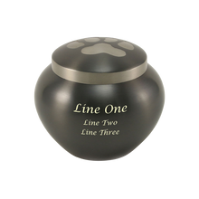 The Slate Paw Print Medium Pet Cremation Urn is crafted from durable brass with a sleek slate finish accented by polished paw prints on the lid. Designed to hold up to 40 cubic inches of ashes, it is suitable for a pet weighing up to 40 lbs. Its rounded silhouette and contrasting silver accents create a timeless look that honors your companion with dignity. A threaded screw-top closure ensures a secure seal, while optional engraving allows for personalization.