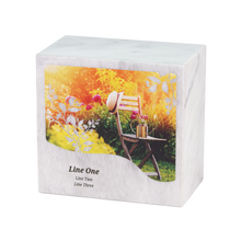 The Sunlit Garden White Marble Adult Cremation Urn features a peaceful garden scene illuminated by warm sunlight, symbolizing comfort and cherished memories. Crafted from solid marble with a natural white marble finish, this urn provides a classic and serene memorial. A full-color artwork panel adds a personal, uplifting touch to the tribute. The urn is designed with a threaded bottom closure for secure ash placement and offers black engraving for personalization.