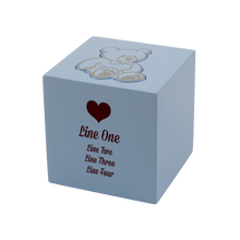 Teddy Bear Design Glossy Baby Small Cremation Urn is a tender memorial crafted from MDF with a glossy baby blue finish and a raised teddy bear motif symbolizing love and innocence. With a 20 cubic inch capacity, it is suitable for infants or as a keepsake portion of ashes. The urn measures 3.4" Ã 3.4" Ã 3.4", closes with a sliding panel at the bottom secured by one screw. Personalization with dark brown engraving is available.