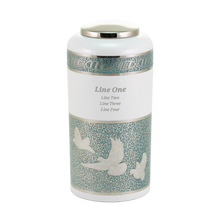 White Brass Adult Cremation Urn with Teal Doves Design