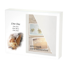 The White Gloss MDF Angel Shadowbox Medium Cremation Urn is crafted from MDF (medium-density fiberboard) with a luminous white gloss finish with angel artwork and a shadowbox display for photos and keepsakes. A discreet ashes compartment is secured by a sliding back panel with screw to keep contents protected while preserving the urn’s clean, modern look. With an 80 cubic inch capacity, this memorial supports personalization with black engraving for names, dates, or a brief message.
