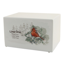 The White Gloss MDF Cardinal Adult Cremation Urn reflects comfort, remembrance, and everlasting love. Expertly crafted from medium-density fiberboard (MDF) with a pristine white gloss finish, this urn features a hand-painted red cardinal resting among green foliage — a touching symbol of hope, renewal, and the spiritual presence of loved ones. A sliding bottom panel held by one screw. Black engraving personalization is available to beautifully commemorate a life remembered with grace.