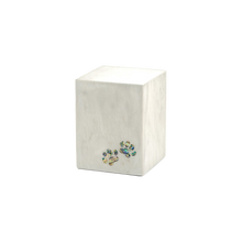 The White Marble Paws Print Inlay Medium Pet Cremation Urn is a timeless memorial made from polished white marble and accented with luminous mother-of-pearl paw inlays. The natural veining of the marble ensures that each urn is unique, with no two ever alike. With a capacity of 47 cubic inches, this urn provides a secure and elegant resting place. A sliding bottom panel secured with a screw keeps contents safe, while optional black engraving allows for a meaningful, personal tribute.