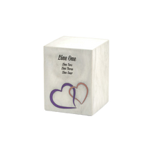 The White Marble Pink Heart Inlay Large Pet Cremation Urn is a handcrafted memorial made from authentic white marble. Its polished finish is accented with two interlocking pink and purple hearts, symbolizing eternal love and devotion. With a 75 cubic inch capacity, this urn provides a secure and elegant resting place for a cherished companion. A sliding bottom panel (1 screw) ensures reliable closure, while optional black engraving allows for names, dates, or a short message. Each urn is unique, with natural marble veining creating a one-of-a-kind tribute.