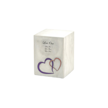 The White Marble Pink Heart Inlay Medium Pet Cremation Urn is a graceful tribute handcrafted from authentic white marble. Its polished surface is highlighted with two interlocking pink and purple hearts, symbolizing love and eternal remembrance. With a 47 cubic inch capacity, this urn provides a secure and elegant resting place for a beloved pet. A sliding bottom panel (1 screw) ensures safe closure, while optional black engraving allows you to personalize the urn with names, dates, or a heartfelt message. Each piece is unique, with natural veining patterns in the marble.
