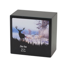 The Winter Elk Scenery Black Marble Adult Cremation Urn is crafted from solid marble and features a peaceful winter landscape with a silhouetted elk. With a 200 cubic inch capacity, it provides suitable space for most adults. This urn secures with a reliable threaded closure at the bottom for safe and easy handling. The scenic artwork invites quiet reflection, and optional white engraving adds a personalized and meaningful tribute.